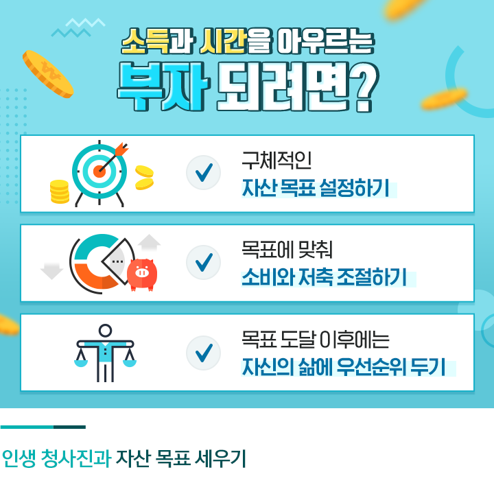 소득과 시간 모두를 아우르는 균형 잡힌 부자가 되려면 경제적 자립이 무엇보다 중요한데요. 이를 위해서는 구체적인 자산 목표를 설정할 필요가 있습니다. '몇 살까지 얼마를 벌어야 돈 걱정에서 벗어날 수 있을까?'라는 질문을 스스로에게 던져보는 것이죠.