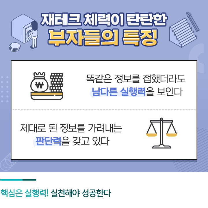 재테크 체력이 탄탄한 부자들의 투자 특징은 재테크가 곧 삶이라는 것입니다. 똑같은 정보를 접했더라도 부자들은 남다른 실행력을 보입니다. 특정 지역에 전철이 뚫린다는 언론 보도를 모두가 접했더라도 누군가는 생각만 하는 반면 다른 누군가는 그 지역의 부동산을 수소문해 매수하는 실질적 액션을 취합니다.