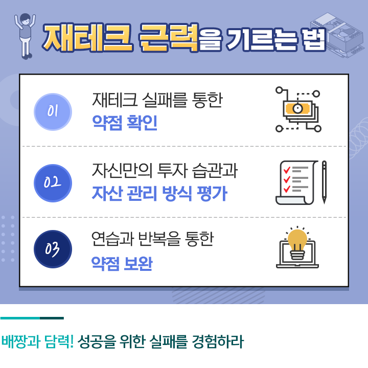 투자에는 당연히 위험성이 따릅니다. 따라서 자신의 실수에 좌절하지 않고 개선하는 단계를 거친다면 재테크 영역에서 자신만의 전문성을 쌓아갈 수 있습니다. 이미 시장에 알려진 정보를 따라, 타인의 선택을 좇아가기만 하는 투자는 불안과 위험을 동반합니다. 재테크의 고수에 다다를 때까지는 스스로 체력을 길러나가는 것이 투자의 성공률을 높입니다.