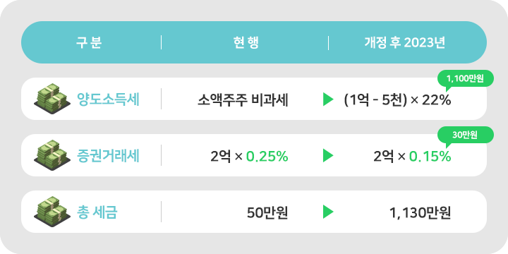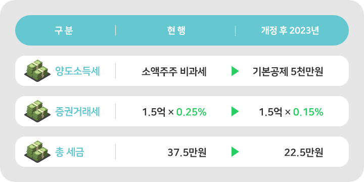 개정 후 2023년에는 소액주주라 하더라도 5천만원 수익은 과세대상이 됩니다. 하지만 기본공제 5천만원을 적용하면 양도소득세 과세금액은 없고, 증권거래세는 0.1% 인하되어 22.5만원만 납부하면 되기 때문에 현재보다 세금이 줄어듭니다.
