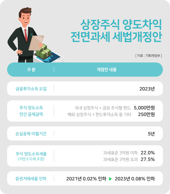 정부는 최근 주식, 파생상품 등으로부터 발생하는 모든 소득을 ‘금융투자 소득’으로 묶어 2023년부터 과세하는 세법개정안을 발표했습니다. 이번 개정안의 주요 내용은 대주주에게만 물리던 주식 양도소득세를 소액투자자까지 전면 확대하는 대신 증권거래세율은 현재 0.25%에서 0.15%로 인하한다는 것입니다.