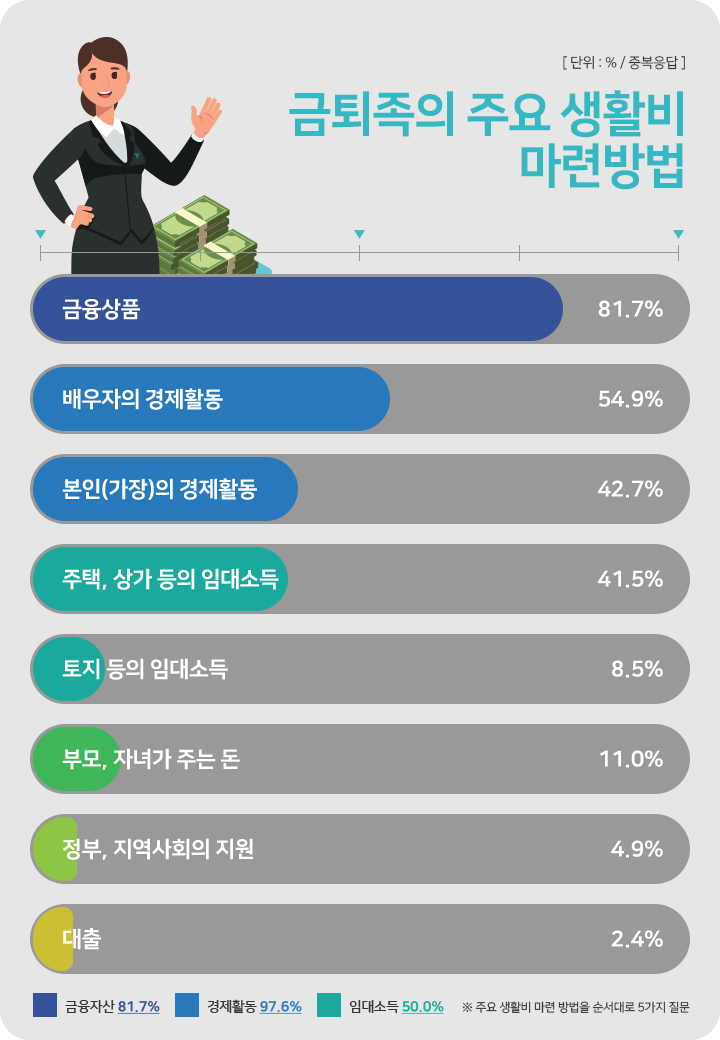 금퇴족은 경제활동, 금융자산, 주택임대, 토지임대, 자녀용돈까지 다양한 소득으로 생활비를 마련하고 있었습니다. 한가지의 수입원이 줄어든다 하더라도 일상에 문제가 되지 않도록 자산을 잘 운용하여 소득원의 분산을 이룬 셈입니다.