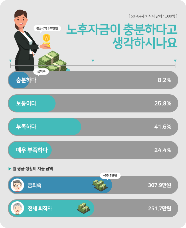 100년 행복연구센터에서는 퇴직 후에도 노후자금이 충분하다고 평가한 사람들을 ‘金퇴족’으로 정의하였습니다. 금퇴족은 전체 응답자 가운데 단 8.2%를 차지하였는데 금퇴족의 월 평균 생활비는 308만원으로 전체 퇴직자보다 56만원을 더 지출하면서도 현재 생활비를 마련하는데 어려움이 없다고 응답하였습니다.
