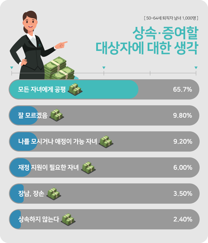 상속과 증여, 아직도 부자들만의 이야기 일까요? 100년 행복연구센터는 50대 이상 퇴직자 1,000명을 대상으로 상속, 증여에 대한 솔직한 생각을 물어보았습니다.
