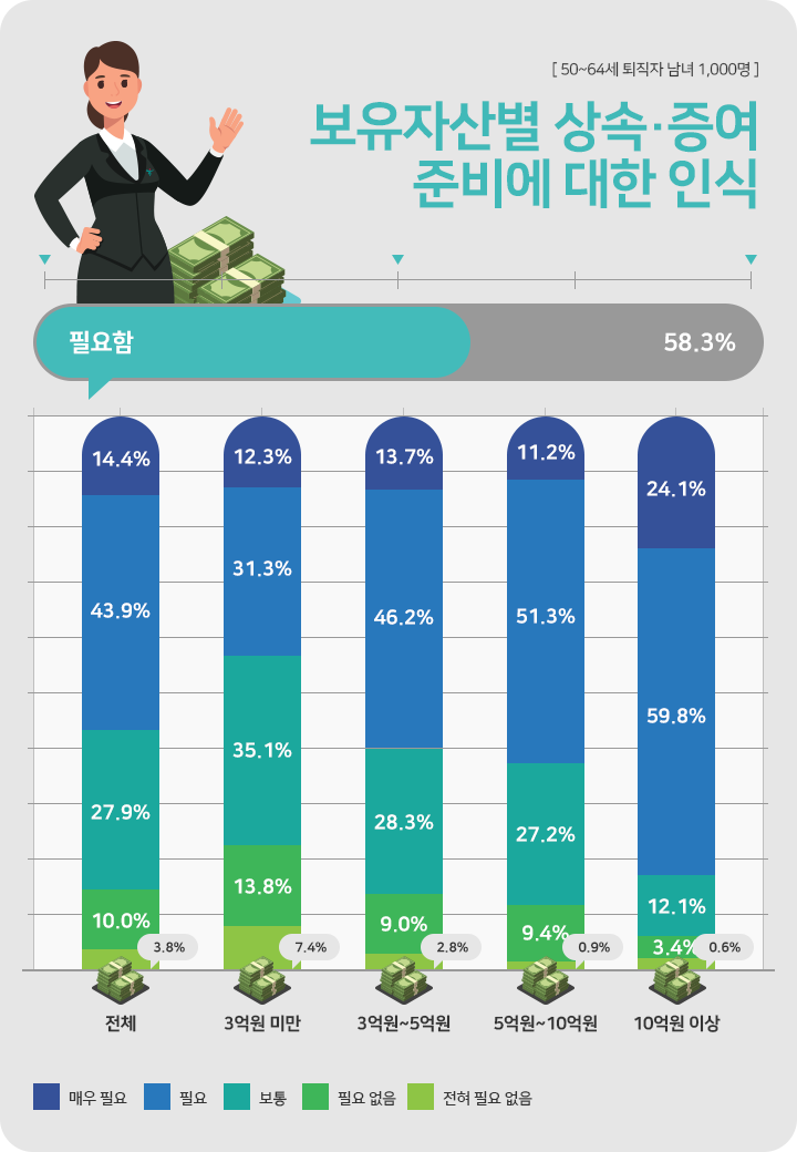 조사에 따르면 자녀들을 위한 ‘상속, 증여는 생전에 준비해야 한다’는 의견이 58.3%로 높게 나타났습니다. 10억 이상의 자산을 보유하고 있는 퇴직자들은 무려 83.9%가 준비해야 한다고 응답했을 정도로 보유자산이 클수록 그 비중은 높았습니다. 보유자산의 규모에 따라 금액만 차이가 있을 뿐 누구나 자녀를 위한 재산 이전은 미리 계획을 통해 준비하고자 했습니다.