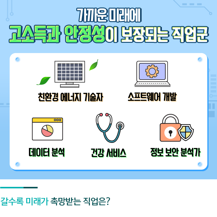 디지털 범죄가 날이 갈수록 고도화되면서, 디지털 보안에 신경을 쓰는 기업이나 개인이 많아졌습니다. 정보 보안 분석가는 IT 업종 직업군 중에서도 높은 연봉에 속한다고 하네요. 아울러 최근 이례적인 기후 변화로 환경 오염 문제가 크게 대두되는 분위기인데요. 환경 파괴 없이 에너지를 얻을 수 태양, 풍력 등 친환경 에너지에 대한 수요가 점차 높아질 전망입니다.