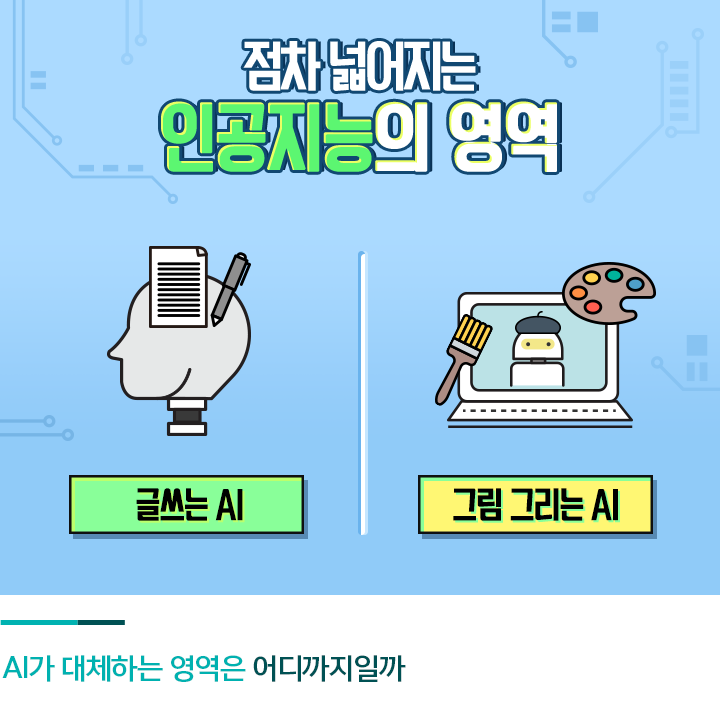 과연 인공지능으로 대체 불가능한 영역은 어디에 있을까요? 인공지능은 창의적인 일을 해낼 수 없을 것이라고 예상하는 분도 있겠지만, 사실 그렇지 않습니다. 미국의 인공지능 연구기관인 ‘오픈 AI’는 글쓰는 AI를 개발했는데요. 이 AI를 교육하기 위해 800만 개의 웹 페이지에 담긴 단어 15억 개를 입력했다고 하네요.