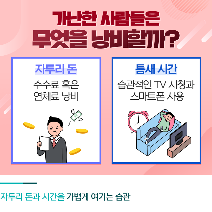 우리를 가난하게 만드는 첫 번째 습관은 ‘자투리 돈을 낭비하는 습관’입니다. 가끔 현금자동입출금기(ATM) 출금 수수료나 신용카드 할부 수수료, 각종 공과금 연체료를 지불하는 것을 가볍게 여기는 분들이 있는데요. 조금만 신경 쓴다면 얼마든지 아낄 수 있는 돈이지만, 잃어도 아쉬울 것 없는 ‘푼돈’이라는 생각 탓에 낭비하는 경우가 대다수입니다.