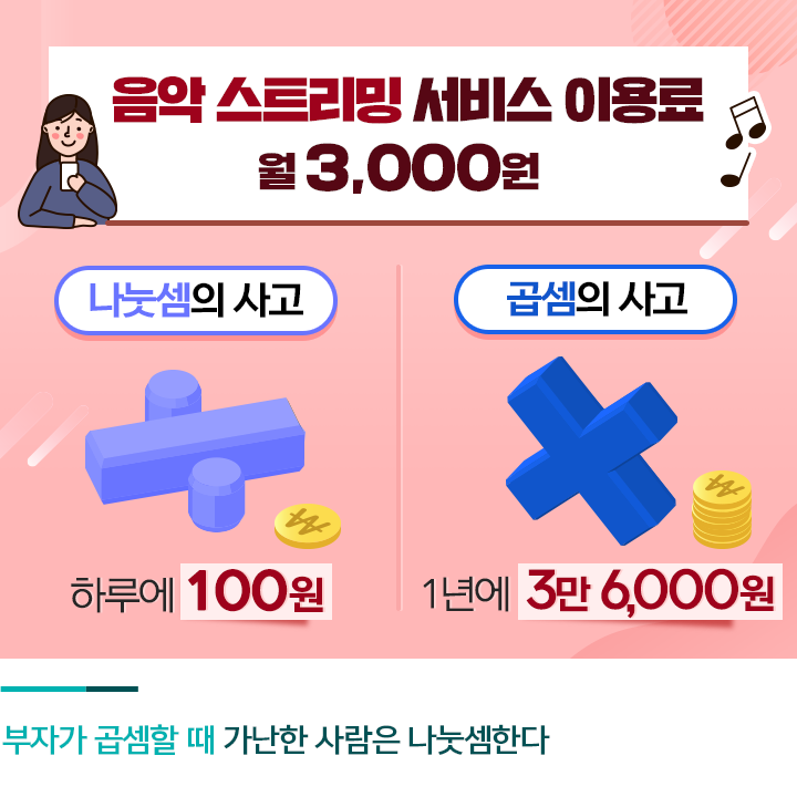 세 번째는 ‘무엇이든 나눗셈하는 사고방식’입니다. 한 달 서비스 이용료가 3,000원인 음악 스트리밍 서비스를 예로 들어보겠습니다. 여러분은 이 서비스의 요금을 ‘하루에 100원’이라고 생각하시나요? 아니면 ‘1년에 3만 6,000원’이라고 생각하시나요? 아무리 큰 금액을 지출했다고 할지라도 하루 단위로 나눠 놓고 보면 적게 느껴지기 마련입니다.