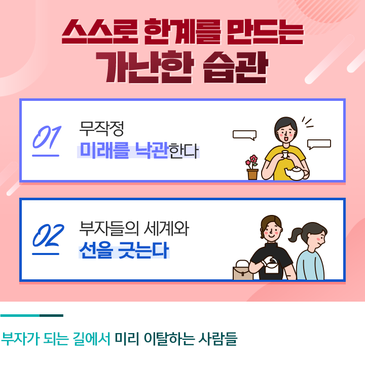‘세 살 버릇 여든까지 간다’는 속담이 있듯, 습관을 고치는 것은 쉬운 일이 아닙니다. 하지만 반대로 생각하면 한번 들인 좋은 습관 역시 평생 간다고 해석할 수 있는데요. 오늘 소개해드린 ‘가난한 습관’은 버리고, 그 자리에 ‘성공한 부자들의 습관’을 채워 넣는 것은 어떨까요?