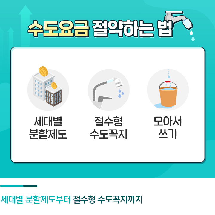 다가구 주택에 거주하는 분들은 한 번쯤 겪어보았을 법한 일인데요. 계량기 하나를 여러 가구가 공동으로 사용한다면 누진율로 인해 수도요금이 사용한 것보다 더 많이 나올 수 있습니다. 이 경우 다가구 홈페이지(www.dagagu.go.kr)나 관할 동사무소에 방문해 가구 분할신청을 해주는 게 좋습니다. 세대 분할을 거치면 가구당 월평균 사용량으로 요금이 계산돼 수도요금을 아낄 수 있어요. 단 세대 분할은 전입신고 이후에만 신청할 수 있습니다.