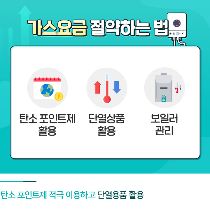 에너지 절약과 함께 짠테크를 실천하려는 분들에게는 정부의 ‘탄소 포인트제’를 추천 드립니다. 도시가스뿐만 아니라 수도, 가스 사용량을 절감하면 감축률에 따라 마일리지를 적립해 주는 제도인데요. 6개월간 가정 내 가스, 전기, 수도 사용량을 비교해, 지난 2년보다 10~15% 이상 감축하면 최대 10만 점까지도 에코머니 포인트를 적립할 수 있습니다. 인센티브로 받은 포인트는 대중교통 이용이나 친환경 제품을 구매하는 데도 쓸 수 있다고 하네요.
