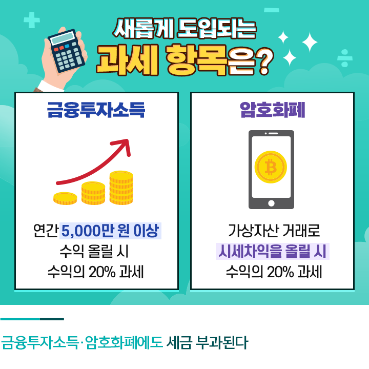 내년 10월 1일부터는 암호화폐(가상자산) 거래로 시세차익을 올리면 수익의 20%를 세금으로 내야 합니다. 그동안 암호화폐 등 가상자산으로 인한 거래소득은 비과세 대상이었지만, 형평성을 고려해 과세의 필요성이 꾸준히 제기되어 왔는데요. 가상자산 거래소득은 소득세법의 ‘기타소득’에 포함될 예정입니다.