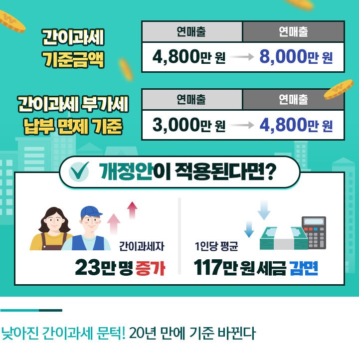 그런데 이번 세법개정안에서 간이과세 기준금액이 연 매출액 4,800만 원에서 8,000만 원으로 확대된 것이죠. 또 간이과세자 가운데 부가가치세 납부를 면제받을 수 있는 대상의 기준도 연 매출액 3,000만 원에서 4,800만 원으로 확대됐습니다.