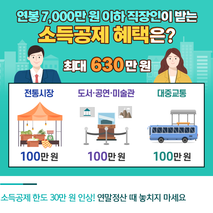 직장에서 받는 급여 총액이 7,000만 원 이하라면 도서·공연·미술관, 전통시장, 대중교통 사용금액에 대해서도 각 100만 원씩 최대 300만 원의 소득공제를 받을 수 있는데요. 이에 따라 급여가 7,000만 원 이하인 사람은 모든 세액 감면 혜택을 더했을 때 최대 630만 원까지 소득공제를 받을 수 있습니다.