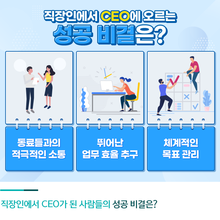그렇다면 이들이 평범한 사원에서 CEO가 될 수 있었던 비결은 무엇이었을까요? 승진을 위해서는 무엇보다도 ‘일 잘하는 사람’이 되어야 하는데요. 전문성을 키우기 위해 지속적으로 학습하고 능력을 개발하려는 노력이 필요합니다.