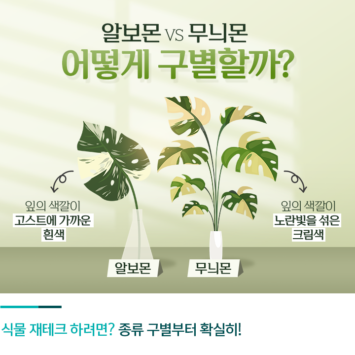 다만 초보자의 경우 색깔로 구별하는 것이 쉽지만은 않은데요. 작은 유묘가 아닌, 줄기가 큰 성체라면 구별이 더욱 쉬워집니다. 잎 뒷장을 확인했을 때 잎에 주름이 많고, 줄기 사이 마디가 굉장히 짧다면 무늬몬일 가능성이 높습니다. 반대로 잎 뒷장에 주름이 없고, 줄기 사이 마디가 손가락 한 마디 이상으로 길다면 알보몬인 경우가 많습니다.