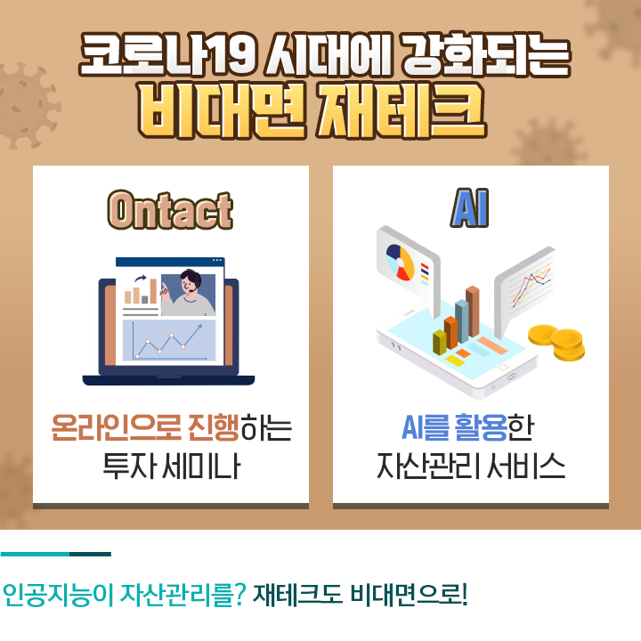 코로나19는 재테크 환경에도 큰 영향을 끼쳤습니다. 경제 위기 속에서 늘어난 유동성 때문에 호황을 맞은 투자 분야도 있고 그렇지 못한 투자 분야도 있지만, 사회적 분위기 속에 비대면 금융 서비스가 대폭 강화된 모습입니다.