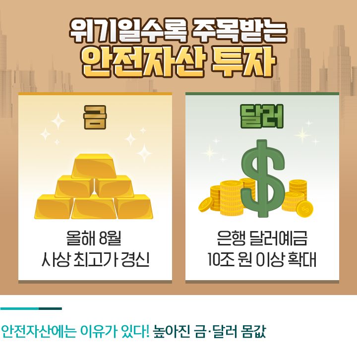 금과 달러의 공통적 특징은 ‘높은 수익’을 기대하기보다는 ‘위기에 대비한 보험’의 성격으로 고려할 만한 안전자산이라는 점인데요. ‘화폐가치 하락’과 ‘초저금리’라는 악조건 속에서 재테크 전략을 방어적으로 세우는 투자자들이 많아지면서, 금과 달러가 주목받는 모습입니다.
