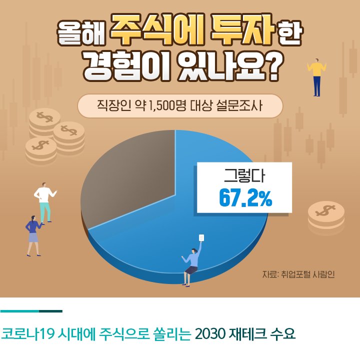 최근 한 취업포털에서 직장인 약 1,500명을 대상으로 진행한 설문조사 결과, 응답자의 67.2%가 ‘올해 주식에 투자한 경험이 있다’고 답했습니다. 또한 49.1%는 ‘투자 경험이 6개월 이하’라고 응답했는데요. 코로나19로 주가가 급락하자 이를 기회로 보고 주식 투자에 뛰어든 젊은 세대가 많아진 것이죠.