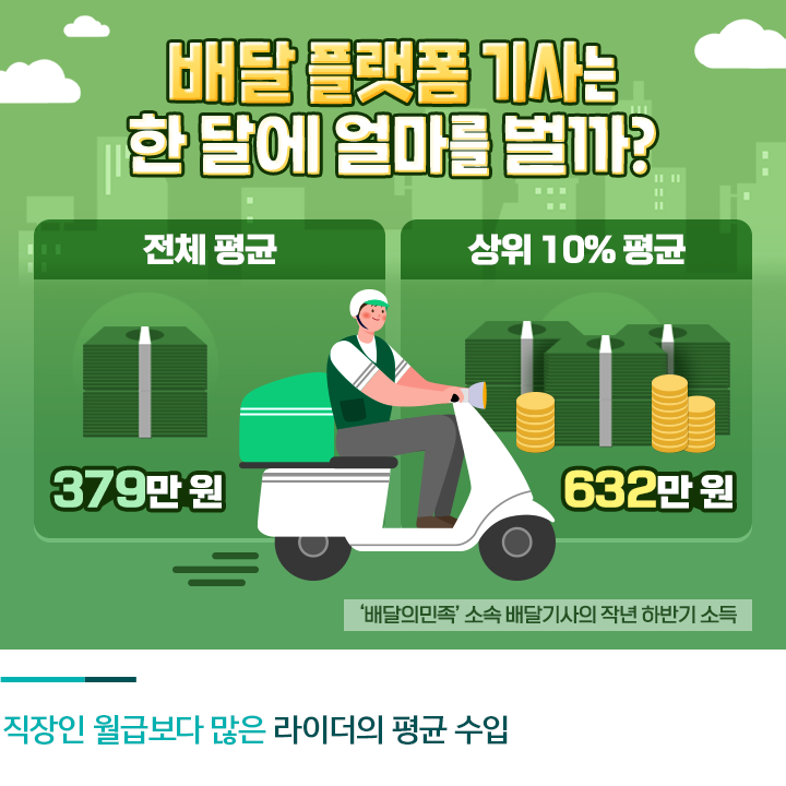대표적인 배달 플랫폼인 ‘배달의민족’을 운영하는 우아한형제들에 따르면, 소속 배달기사인 ‘배민라이더스’의 지난해 하반기 월평균 소득은 379만 원입니다. 또 이중 상위 10%는 평균 632만 원에 달하는 고소득을 올렸다고 하는데요. 고용노동부가 조사한 직장인 월평균 급여인 374만 원을 웃도는 수준이죠.