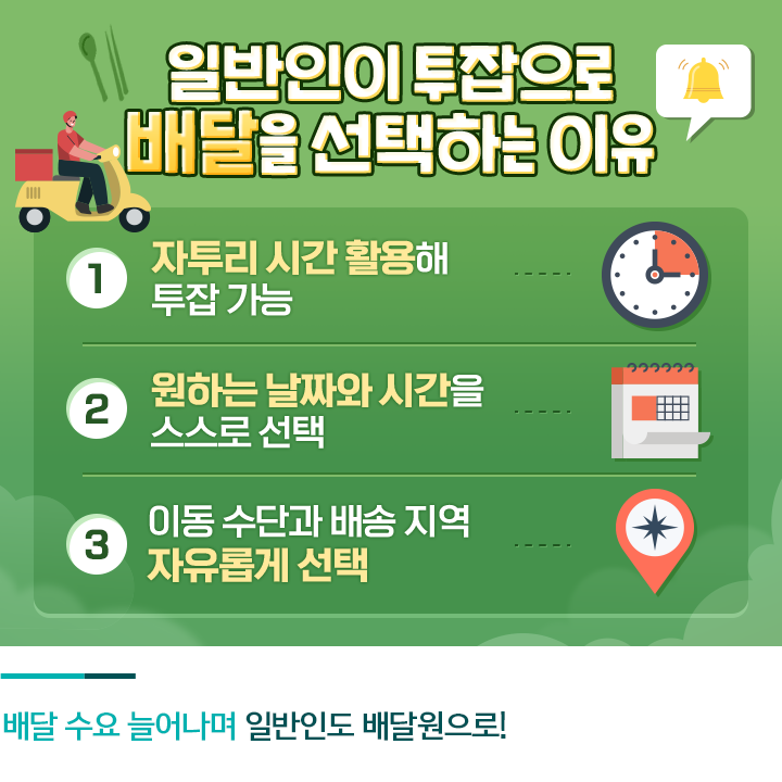 배달 인력에 대한 수요가 급증하면서 관련 일자리도 늘고 있습니다. 전문 배달원뿐만 아니라 직장인이나 대학생, 주부 등 일반인도 자투리 시간을 활용해 배달 일을 할 수 있는 기회가 많아졌는데요. 원하는 시간에만 자유롭게 일할 수 있다는 점 때문에 요즘 인기 있는 투잡 알바로 떠올랐습니다.