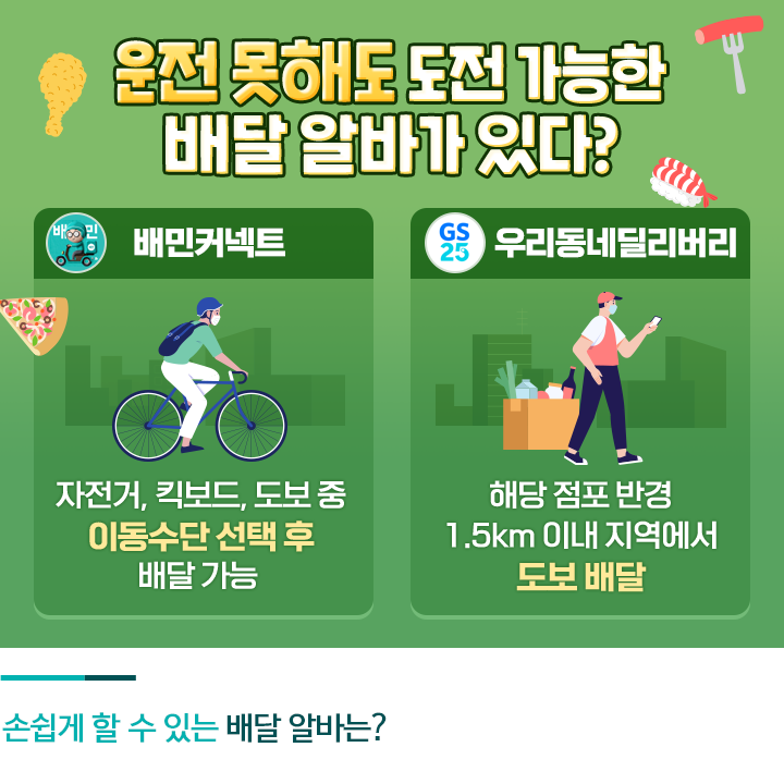 운전을 못한다면 자전거나 도보 배달 일자리도 있습니다. 본인이 원할 때만 원하는 시간만큼 배달 아르바이트를 할 수 있는 ‘배민커넥트’는 자동차뿐만 아니라 자전거나 킥보드, 도보로도 참여할 수 있습니다.