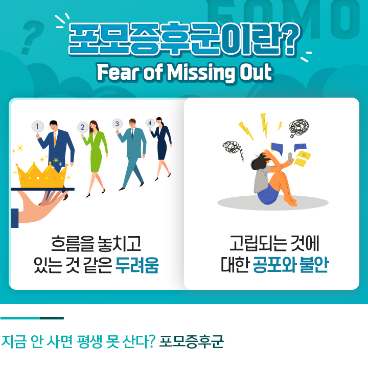 경제 전문가들은 이런 공포와 공황상태를 ‘포모증후군(Fear of Missing Out)’이라고 진단합니다. 포모증후군은 자신만 흐름을 놓치고 있는 것 같은 두려움 또는 고립되는 것에 대한 공포를 뜻하는데요.