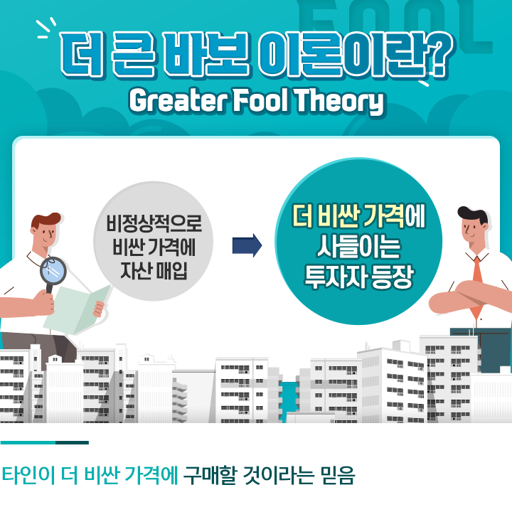 자산 가치가 비정상적으로 높은데도 불구하고, 해당 자산을 비싼 가격에 매입하는 경우를 종종 본 적 있으시죠? 이들은 자신이 비싼 가격에 비정상적인 자산을 매입한 '바보'라고 할지라도, 그보다 더 비싼 가격에 사들일 '더 큰 바보'가 있다는 믿음을 갖고 있다고 합니다. 이런 이유로 지나치게 높은 가격에 자산을 매입했다가 큰 손해를 경험하는 사례가 생겨나는 것이지요.