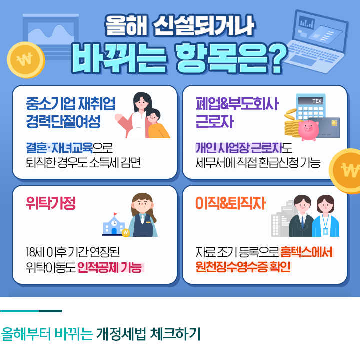 연말정산에서 세금 폭탄을 피하고 더 많은 환급을 받기 위해서는 새롭게 바뀌는 세법도 꼼꼼하게 챙겨야 하는데요. 올해부터 신설되거나 바뀌는 주요 항목을 살펴볼까요?