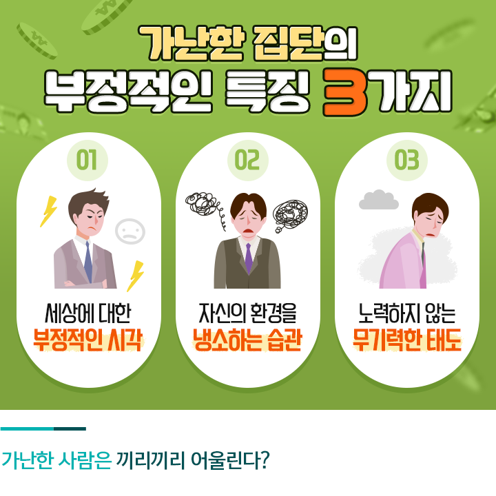 토마스 콜리는 가난한 집단의 특징을 크게 세 가지로 정의했는데요. 첫 번째는 세상에 대한 부정적 시각, 두 번째는 자신의 환경을 냉소하는 습관, 세 번째는 노력하지 않는 무기력한 모습입니다. 이런 모습은 자기 자신을 가난에 머물게 할 뿐만 아니라, 주변 사람에게도 부정적인 영향을 줄 가능성이 높습니다.
