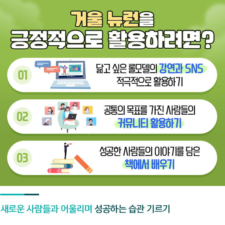 공통의 목표를 갖고 있는 사람들이 모인 커뮤니티에 속하는 것도 좋은 방법입니다. 소속감은 정체성을 강화시키고 동기를 지속시켜 주는데요. 온라인 커뮤니티나 오픈채팅방, 습관 관리 애플리케이션(앱) 등을 통해 공통된 관심사를 가진 사람들과 커뮤니케이션할 수 있는 기회가 점차 많아지고 있습니다. 이런 커뮤니티를 부담 없이 이용해 보는 것도 도움이 되겠죠?