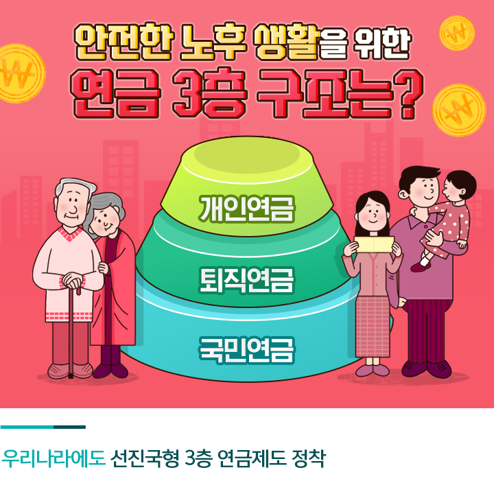 국민연금은 가장 기본적인 생활을 보장해주고, 퇴직연금은 안정적인 생활을 영위할 수 있도록 해준다고 해석할 수 있습니다. 또 개인연금은 보다 여유로운 생활을 보장해준다고 볼 수 있죠.