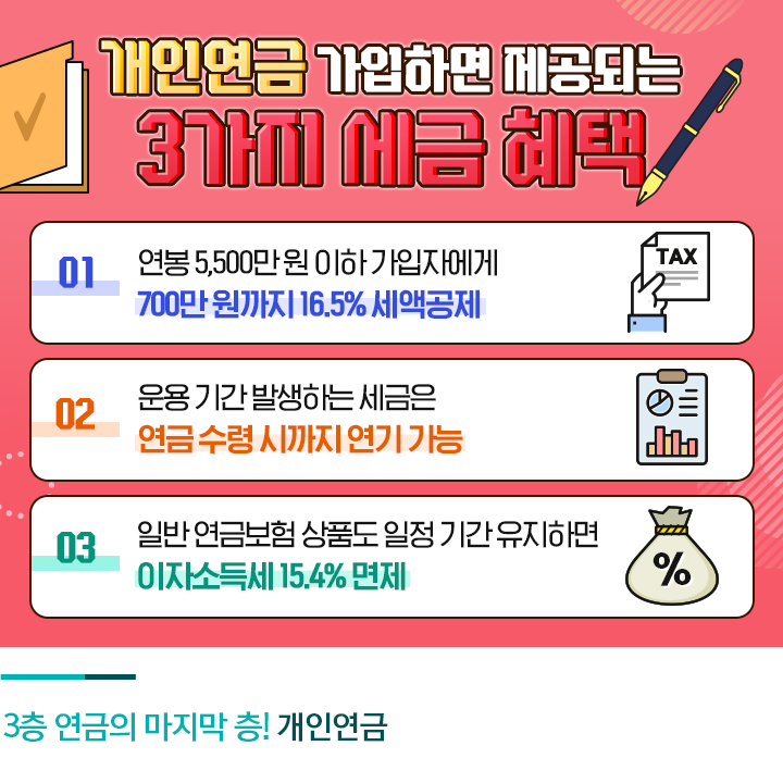 3층 연금 중 국민연금과 퇴직연금은 어느 정도 강제성을 띠지만, 개인연금 가입은 본인의 선택에 달려 있는데요. 3층 연금 구성을 장려하기 위해 정부는 개인연금 가입자에게 다양한 혜택을 제공하고 있습니다. 연간 총 급여 5,500만 원 이하의 연금저축과 IRP 가입자는 700만 원까지 16.5%의 세액공제를 받을 수 있고, 운용 기간 발생하는 수익에 대한 세금도 연금을 수령할 때까지 미룰 수 있는데요.