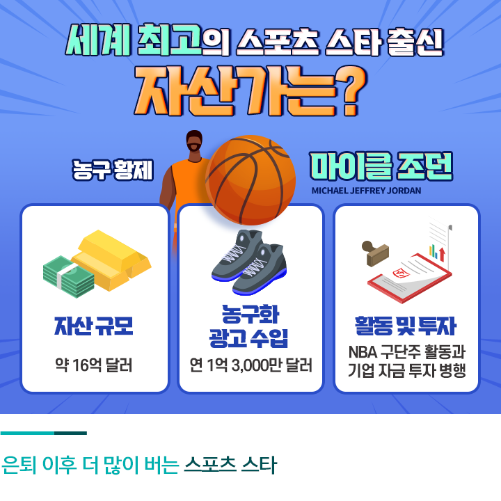 메시가 현재 가장 많은 연봉을 받고 있는 스포츠 스타라면, 마이클 조던은 세계 최고의 스포츠 선수 출신 자산가입니다. 포브스는 2019년 스포츠 스타 출신 부자 1위로 농구 황제 마이클 조던을 선정했는데요. 그의 자산은 약 16억 달러(약 1조 8,000억 원)로 전 세계 부자 중 1,001위입니다.