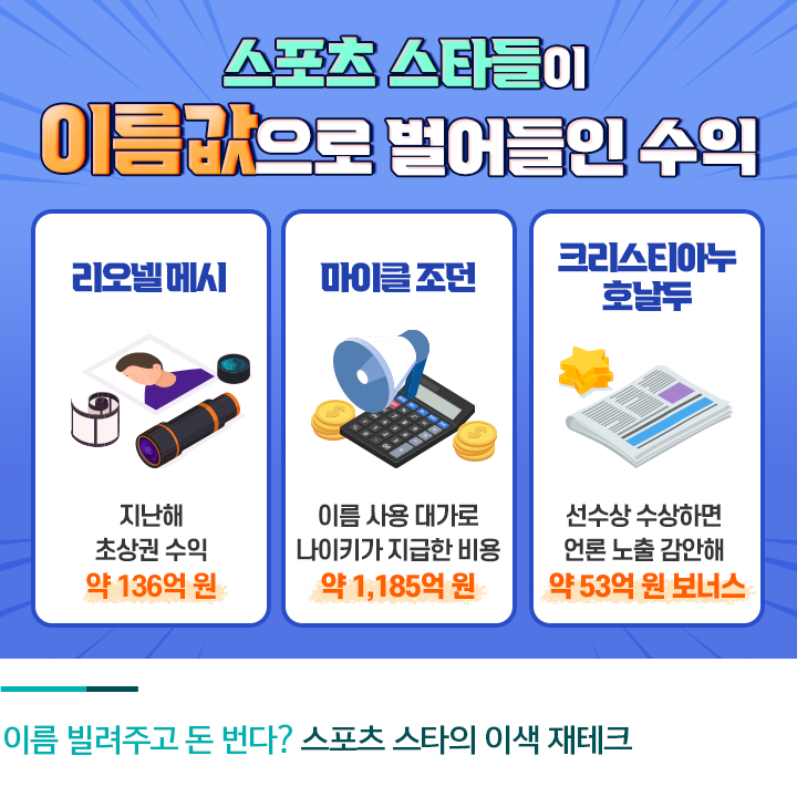 세계적인 스포츠 스타들은 초상권으로 벌어들이는 수익도 남다른데요. 리오넬 메시의 경우 지난해 초상권으로 약 136억 원의 수익을 올렸으며, 마이클 조던은 나이키가 1년간 자신의 이름을 사용하게 해 주는 대가로 약 1,185억 원을 받았습니다.