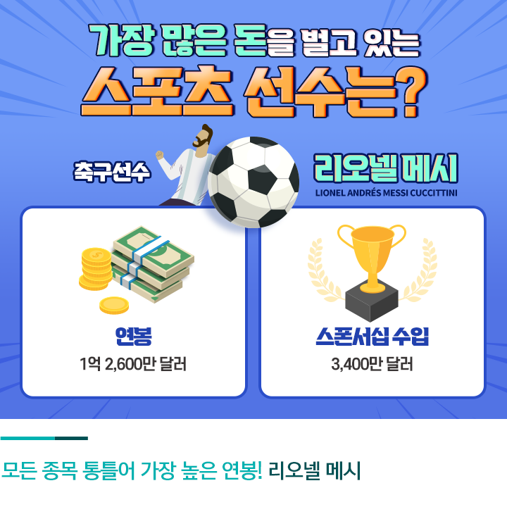 전 세계에서 가장 많이 돈을 버는 스포츠 선수는 누구일까요? 포브스에 의하면 2020년 수입 순위에서 1억 2,600만 달러(약 1,490억 원)의 수입을 올린 축구 선수 ‘리오넬 메시’가 1위를 차지했습니다.