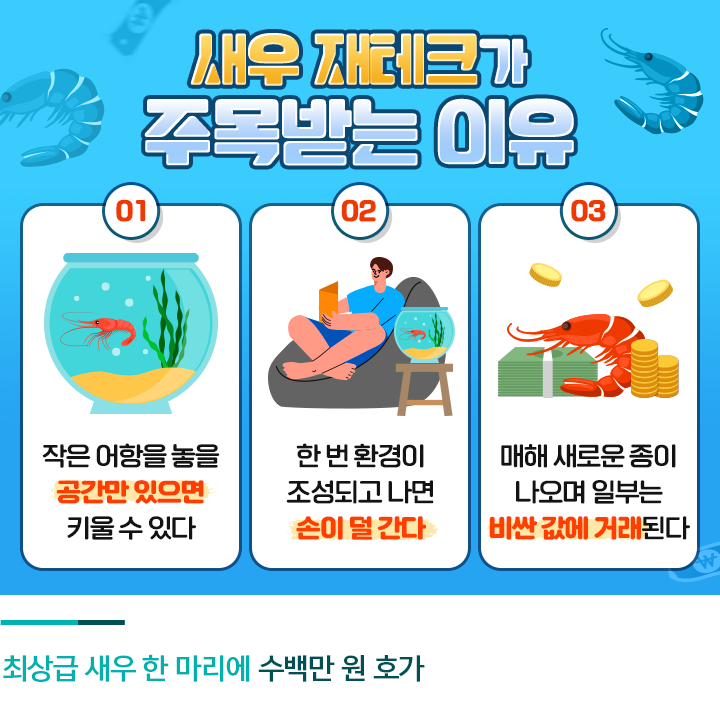 새우를 처음 키우는 사람이라면 누구나 시행착오를 반복할 수밖에 없습니다. 따라서 끈기 있게 경험을 쌓는 과정이 중요한데요. 아이가 있는 가정이라면 학습 효과까지 덤으로 기대할 수 있는 새우 재테크! 지금 한 번 도전해보는 것은 어떨까요?