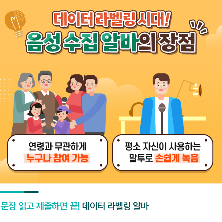 목소리 아르바이트 중에서도 어린이부터 노년층까지 집에서 손쉽게 참여할 수 있는 음성 데이터 라벨링이 인기를 끌고 있습니다. 최근 기업들이 인공지능(AI) 기반 서비스를 여러 영역에서 출시하면서, 다양한 연령대와 말투를 반영한 음성 데이터가 필요해졌기 때문인데요.