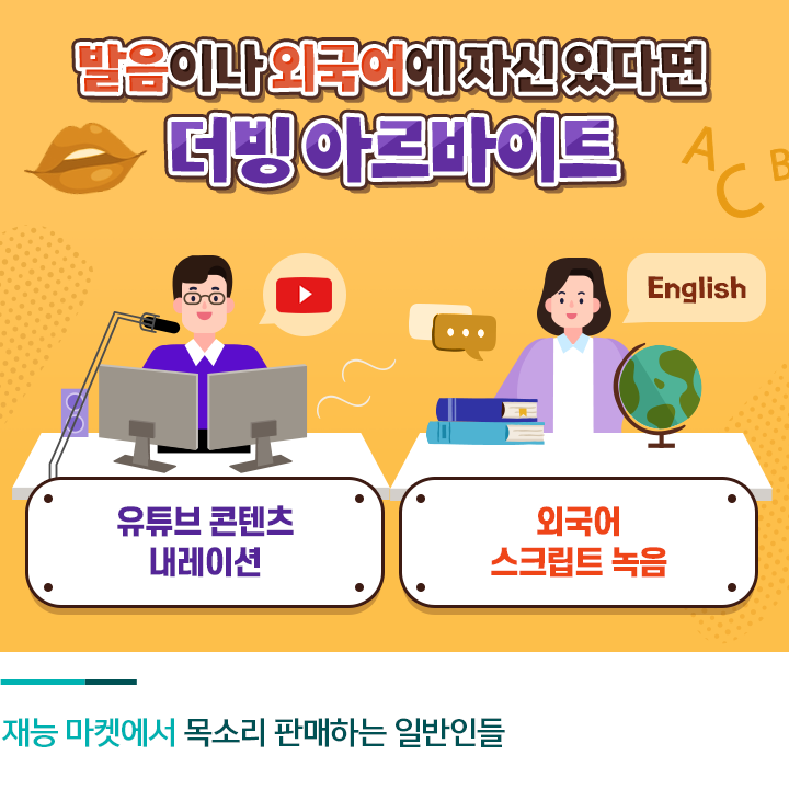 발음에 자신이 있거나 외국어에 능통하다면 각종 더빙 아르바이트에 도전해볼 수 있겠는데요. 최근 유튜브 콘텐츠가 급증하면서 영상물에 내레이션을 더빙하는 아르바이트가 늘어났습니다. 온라인 재능 마켓을 통해 자신의 목소리를 판매하는 경우도 심심찮게 찾아볼 수 있는데요.