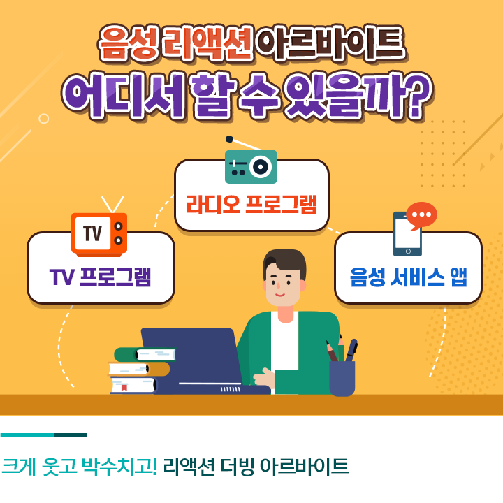 즐겁게 웃고 호응하는 목소리만으로 돈을 버는 아르바이트도 있습니다. TV 예능 프로그램이나 라디오 토크쇼에 들어갈 리액션을 더빙하는 아르바이트인데요. 직접 방송국 스튜디오로 찾아가 녹화에 참여해야 하는 방청객 아르바이트와 달리, 이미 편집을 마친 방송을 시청하며 리액션 하는 방식입니다.