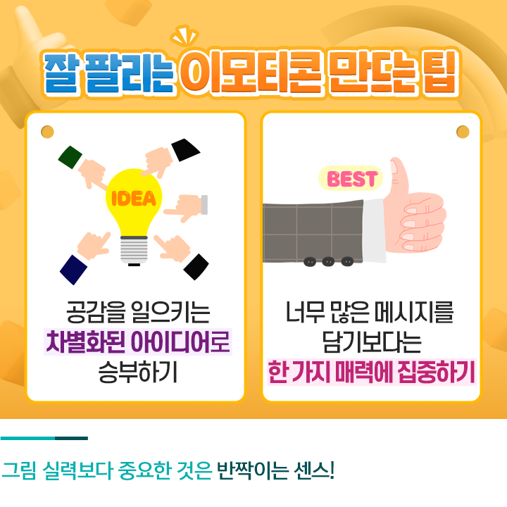 이모티콘을 제작하려면 그림 실력이나 관련 툴을 다루는 기술이 중요할 것이라고 생각하기 쉬운데요. 사실 그림 실력보다 중요한 것은 반짝이는 아이디어라고 합니다. 실제로 이모티콘 시장에서 큰 인기를 얻은 작품들을 살펴보면, 완성도가 높다기보다는 톡톡 튀는 감성이나 공감할 수 있는 메시지를 담은 경향이 있는데요.