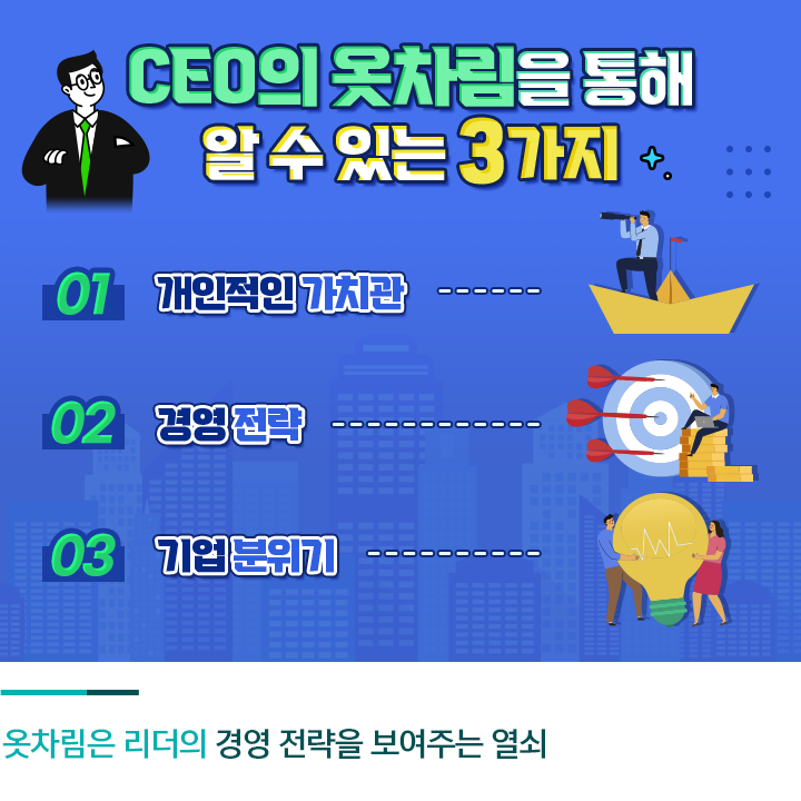 패션도 전략이라는 말이 있습니다. 장점을 살리는 스타일, T.P.O(의복을 경우에 알맞게 착용하는 것)에 딱 맞는 패션은 사람을 한층 돋보이게 해주고, 상대방에게 긍정적인 이미지와 신뢰감을 부여하는데요. 나아가 기업 최고경영자(CEO)나 정치인 등 리더들의 패션을 통해 그들의 가치관이나 전략까지 엿볼 수 있는데요.
