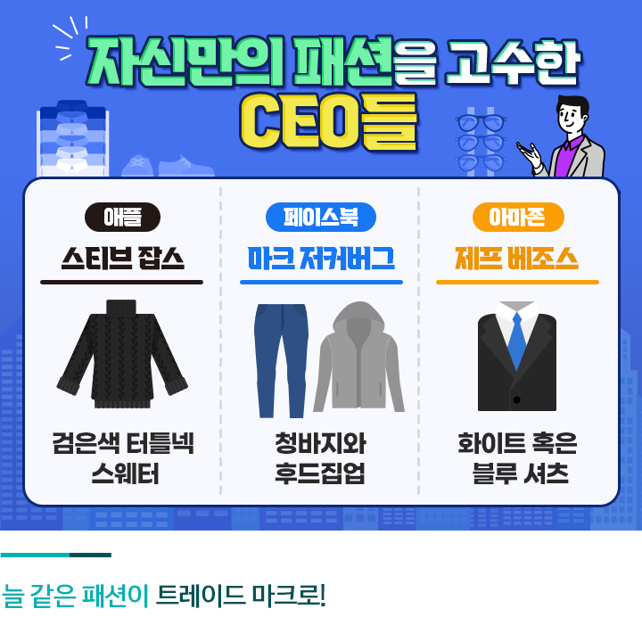 대중 앞에 모습을 자주 드러내는 기업 CEO들은 대부분 자신만의 확고한 패션 스타일을 가지고 있습니다. 혁신과 창의성, 유연함으로 대표되는 IT 기업의 CEO는 심플하고 편안한 캐주얼을 즐겨 입고, 강한 리더십과 신뢰감이 중요한 정치인은 깔끔한 슈트를 선호하는 경향이 있는데요.