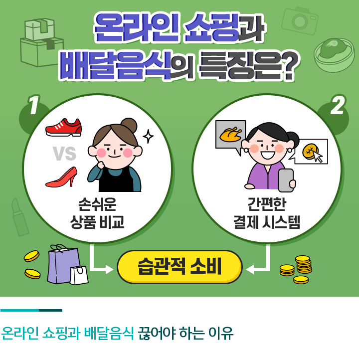 온라인 쇼핑과 배달음식은 한 번 시작하면 습관처럼 이용하게 되기 때문에 빠져나오기 쉽지 않은데요. 두 가지 모두 돈 모으기를 방해하는 습관이라는 점을 인식하고 의식적으로 자제하려는 노력을 기울여야 합니다.