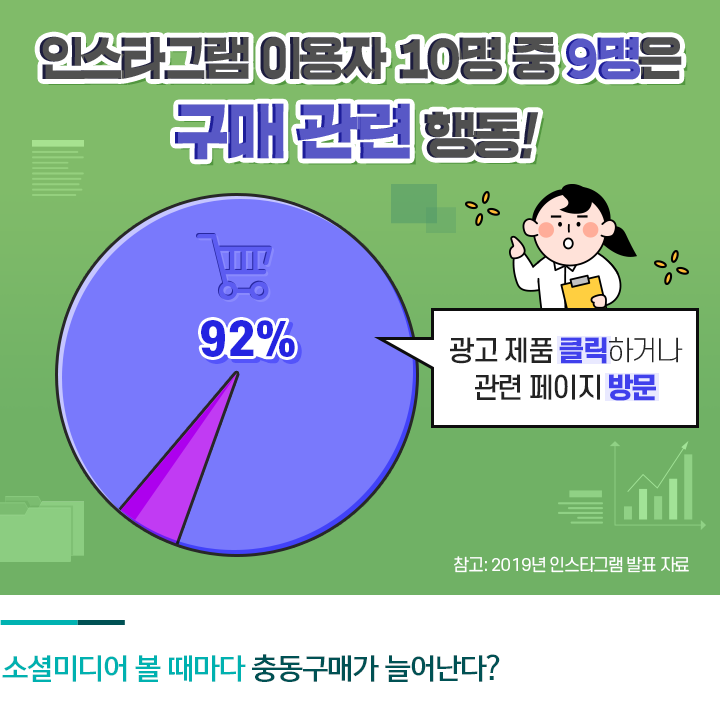 실제로 인스타그램이 2019년 발표한 자료에 따르면, 인스타그램 이용자의 92%는 광고를 접한 뒤 해당 제품을 구매하거나 관련 페이지를 방문하는 것으로 나타났는데요. 소셜미디어에 자주 접속할수록 충동구매 확률이 높아질 수밖에 없습니다. 돈 모으기에 성공하고 싶다면 습관적으로 이용하는 소셜미디어 접속 시간부터 줄일 필요가 있습니다.