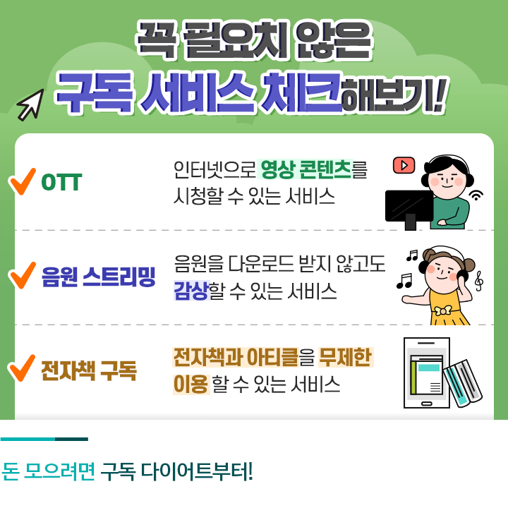 지출하는 고정비가 많을수록 돈을 모으기 어려운 만큼, 각종 구독 서비스는 돈 모으기 계획을 방해하는 요소인데요. 돈을 모으기 위해서는 구독 서비스를 다이어트 할 필요가 있습니다.