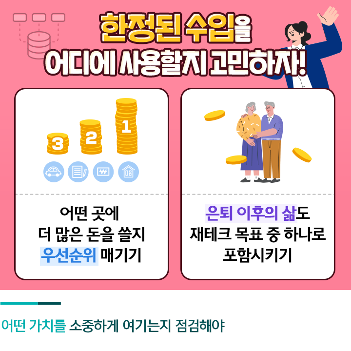 대략적으로 자신이 어떤 가치를 더 소중하게 여기는지 한 번쯤 점검해보는 기회를 가지는 것이 앞으로의 경제생활에 큰 도움이 됩니다. 자신만의 우선순위를 세워 둔다면 그에 따른 돈 모으기 계획을 보다 효과적으로 세울 수 있습니다.
