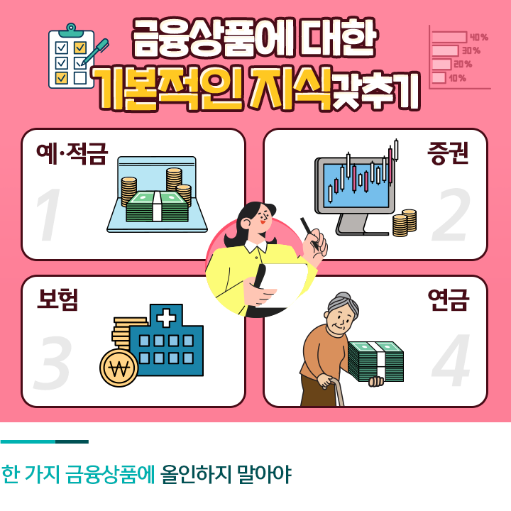 금융상품에 대해 잘 모르면서 제대로 된 재테크를 하는 것은 거의 불가능합니다. 적어도 재테크를 통해 수익을 얻고 싶다면 금융상품에 대한 기본 지식을 갖출 필요가 있는데요. 금융상품은 크게 예금, 보험, 연금, 증권으로 분류할 수 있고, 증권은 다시 주식과 채권, 펀드로 나뉩니다.