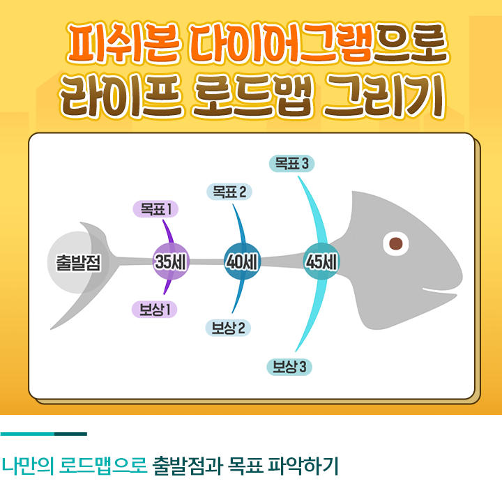 먼저 물고기의 꼬리 부분에 출발점, 즉 현재 시점을 적고 머리 부분에 최종 목표를 적습니다. 그리고 출발점과 최종 목표를 이은 척추 자리에 나이대별 중간 목표와 그에 따른 보상을 적으면 되는데요.